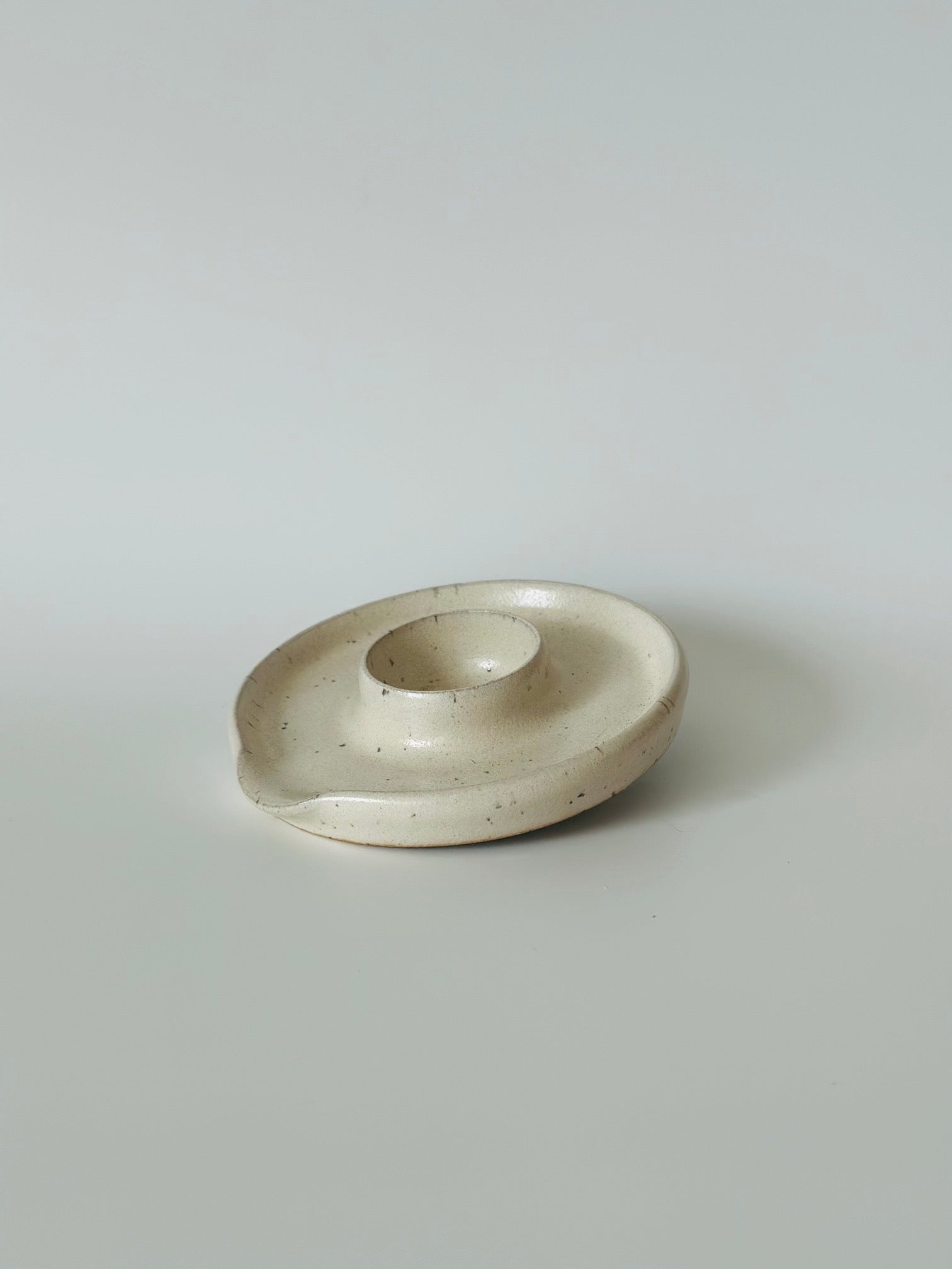 Enkelt æggebæger med både plads til ske, salt og skaller. Hvid med små prikker.