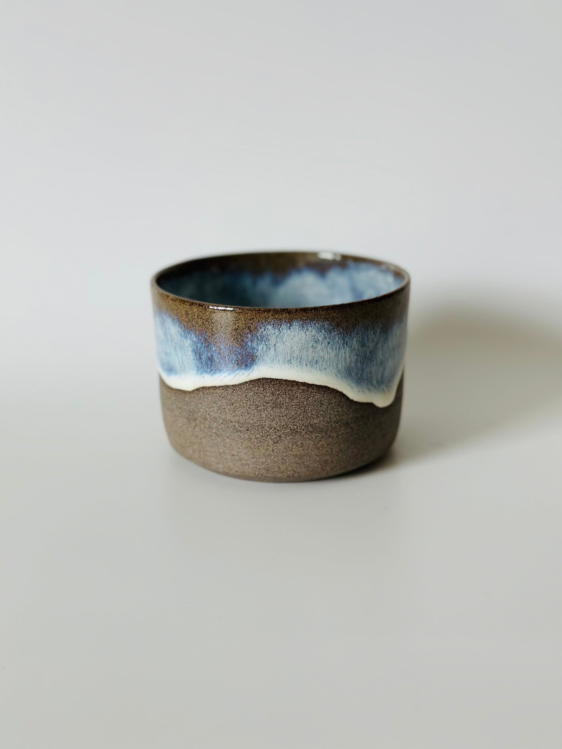 Smuk blå kop med hvid/blå glasur med masser af effekter og farvespil samt løbeeffekt. Rå mørk ler nederst på koppen.
