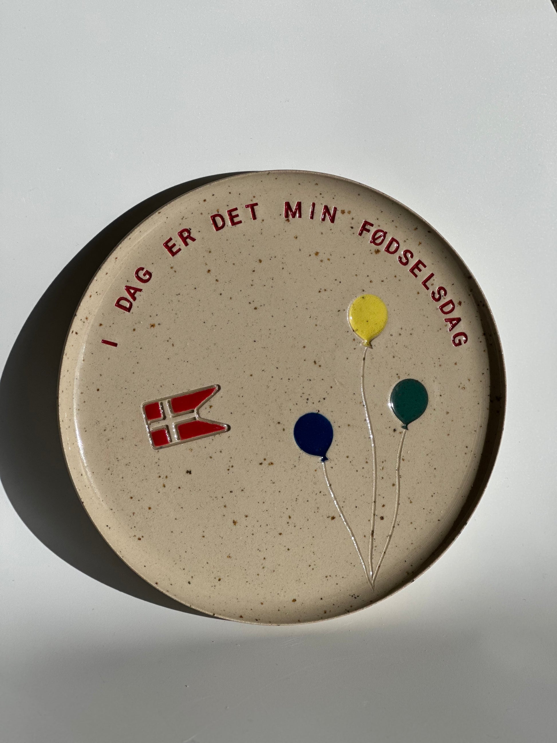 Fint sæt som kan tages frem år efter år. Sættet består af kop med flag langs siden og lille kagetallerken med tekst, et flag og balloner.