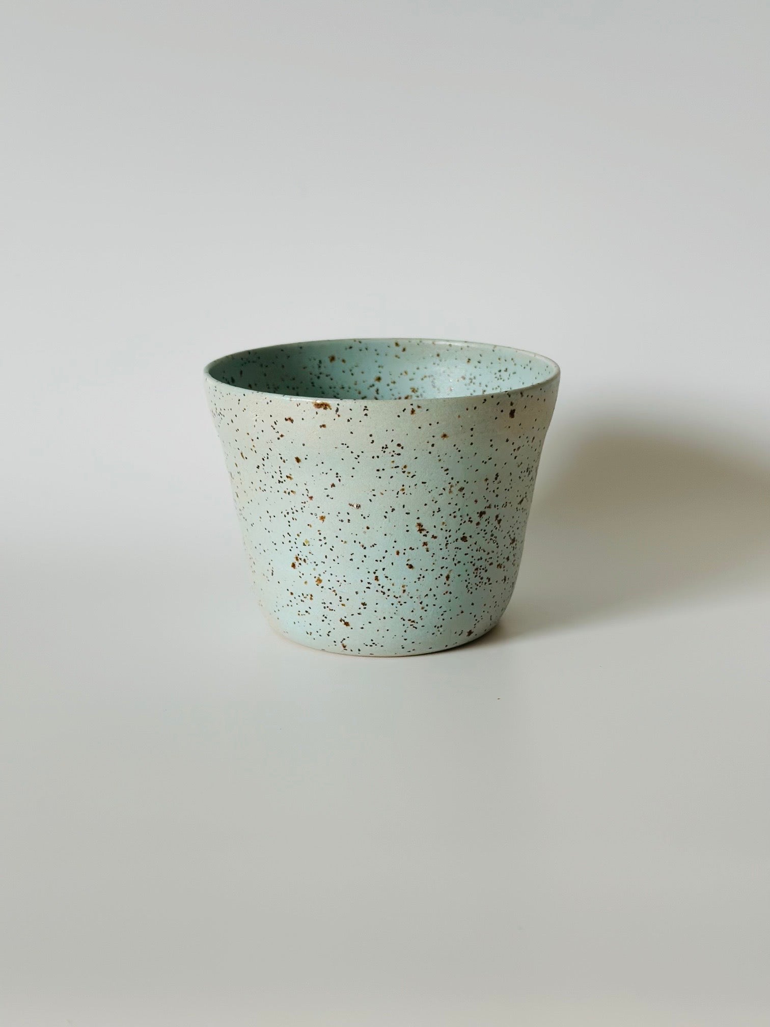 Fin turkisgrøn kop med små prikker. Flad bund så den ikke samler vand i opvaskemaskinen.