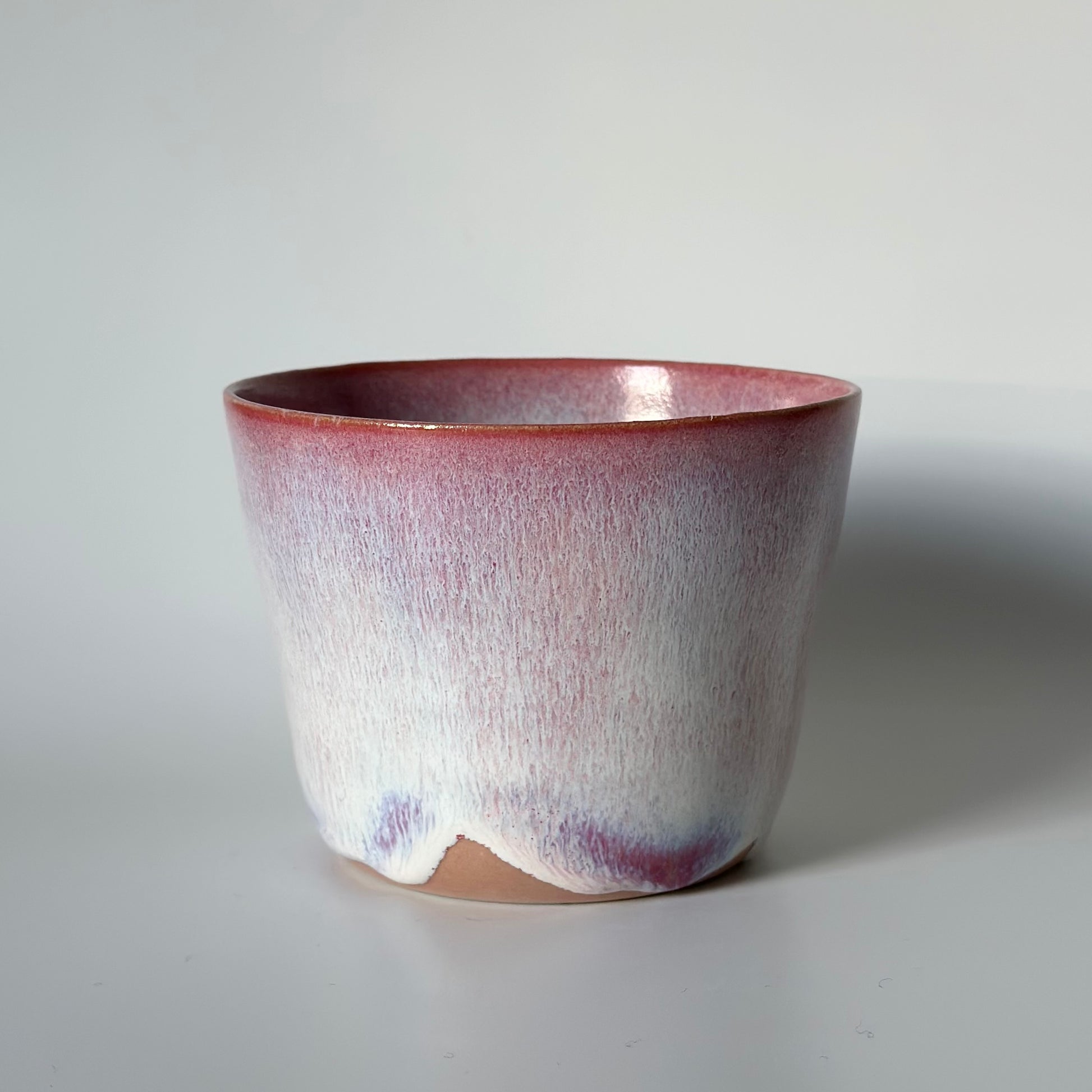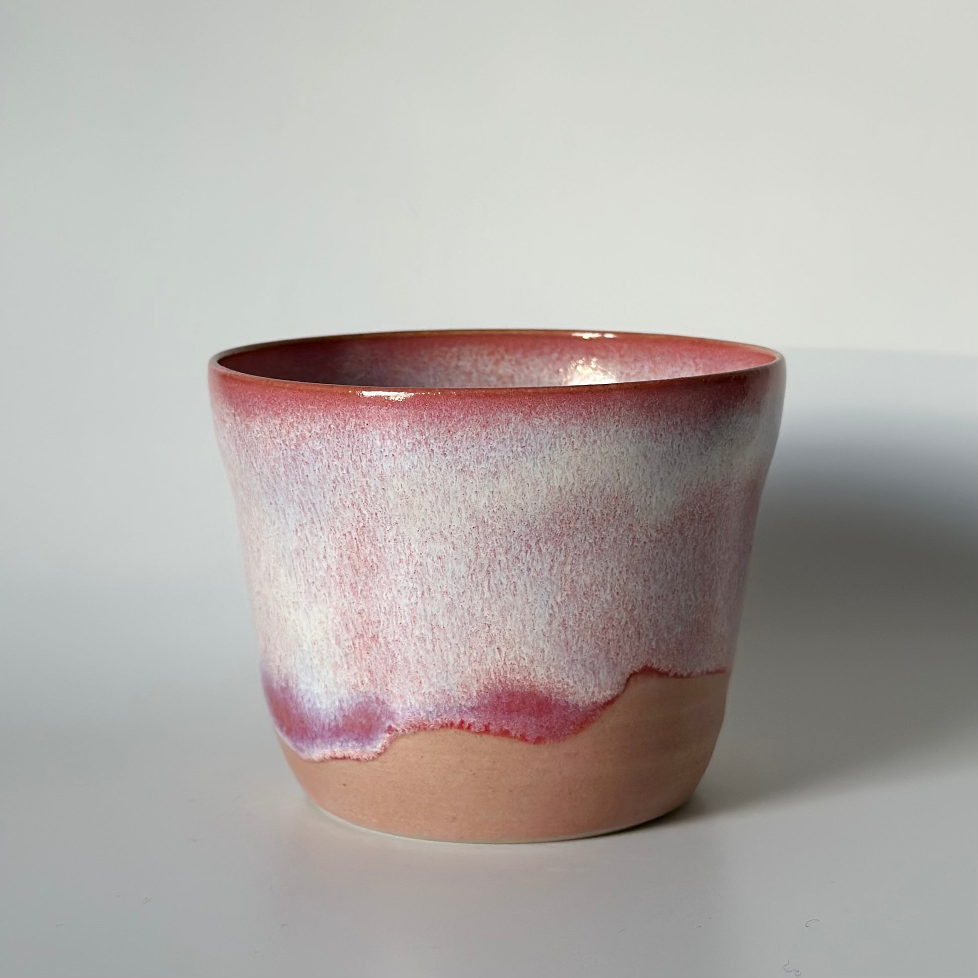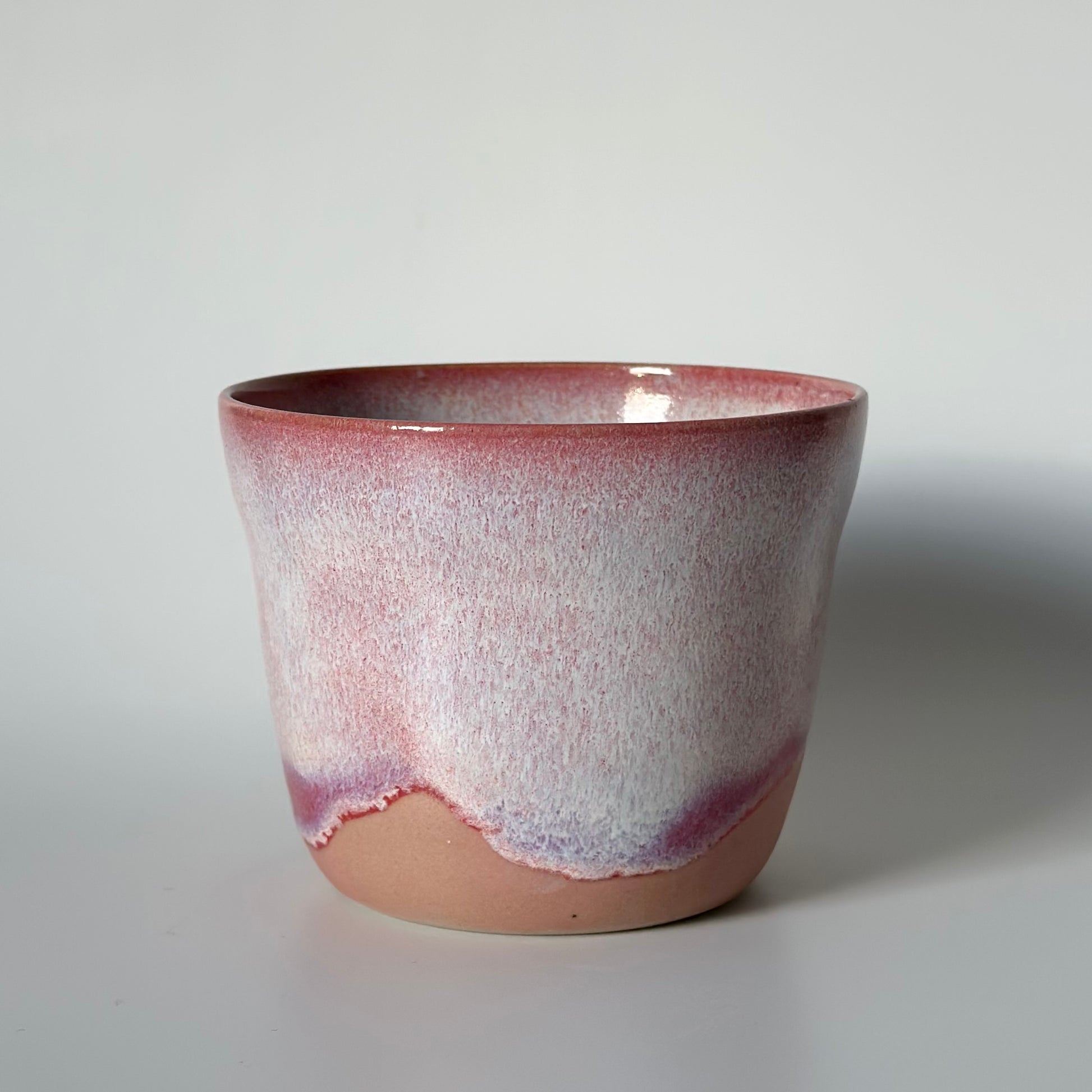 Lyserød kop med smuk pink glasur og mat pink nederst. Masser af spil i farven samt løbeeffekt. Flad bund så den ikke samler vand i opvaskemaskinen.