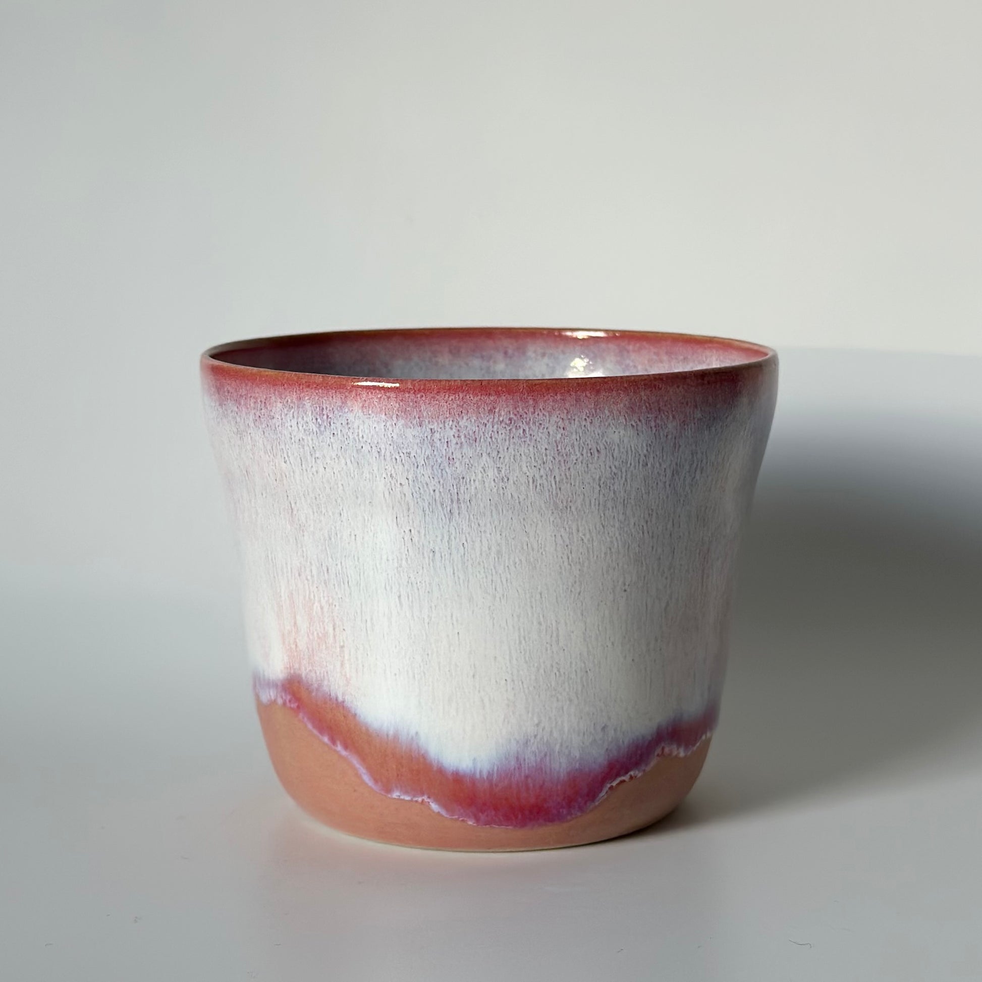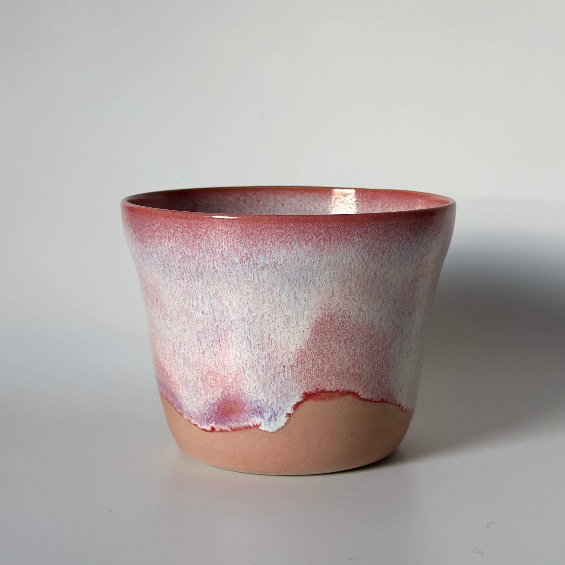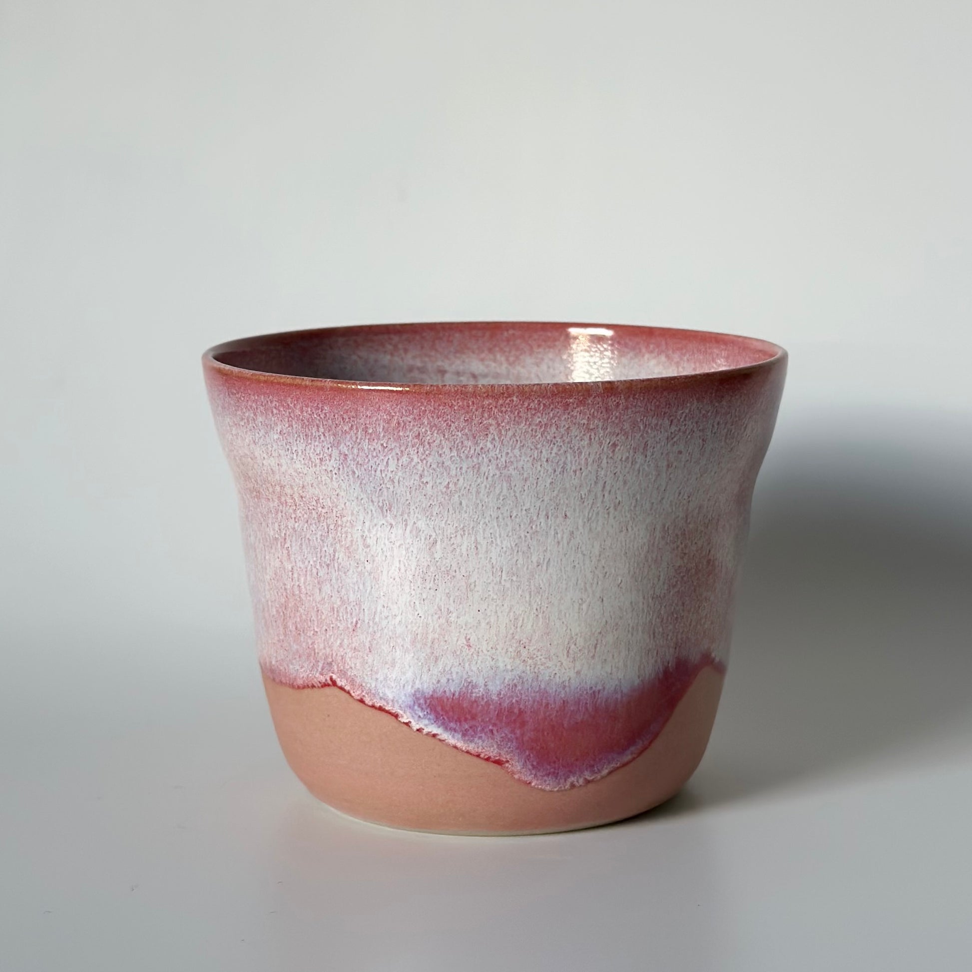 Lyserød kop med smuk pink glasur og mat pink nederst. Masser af spil i farven samt løbeeffekt. Flad bund så den ikke samler vand i opvaskemaskinen.