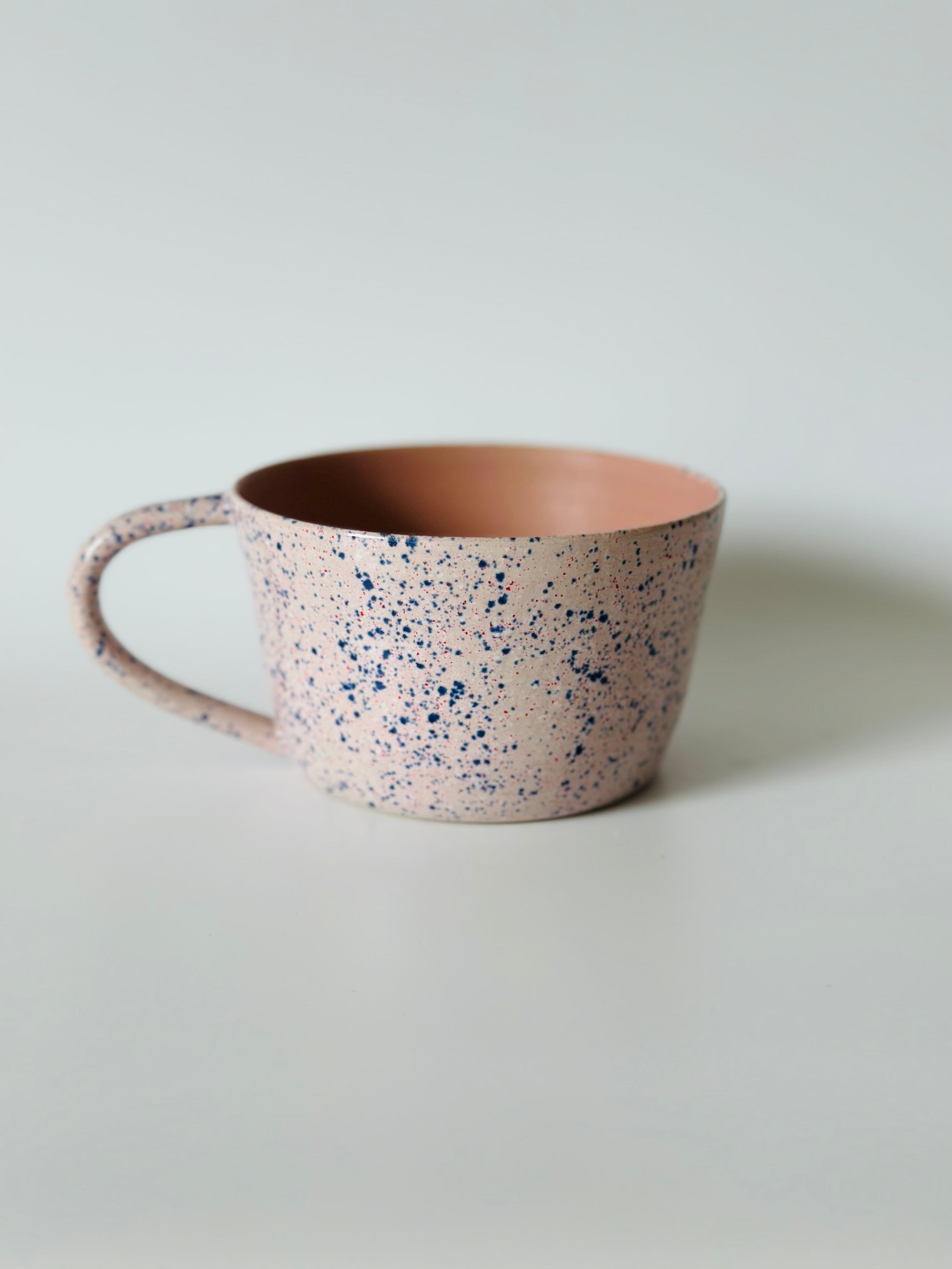 Lyserød kop med hank med blå og røde prikker med lys rosa bundfarve. Inderst i koppen er koppen ensfarvet lyserød.