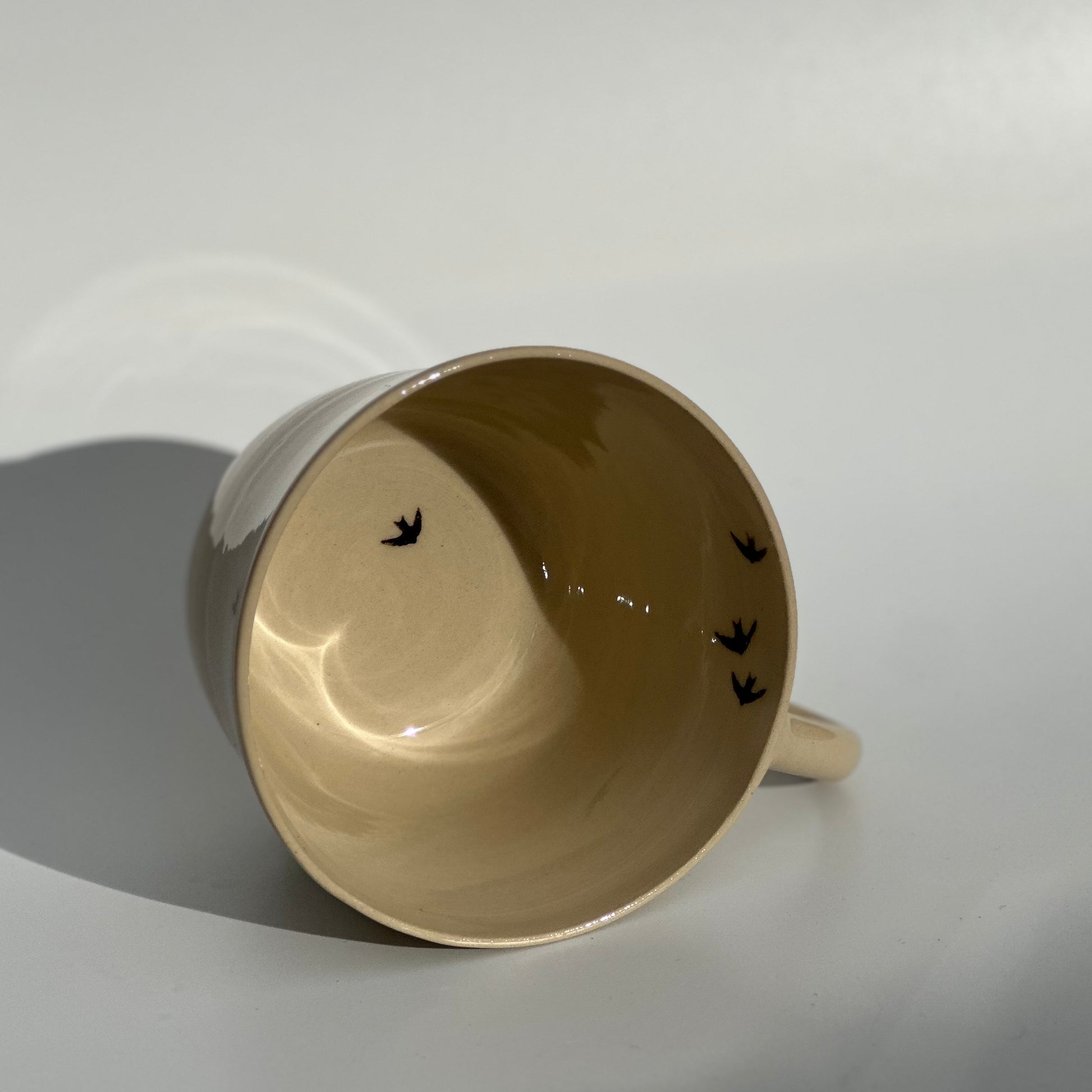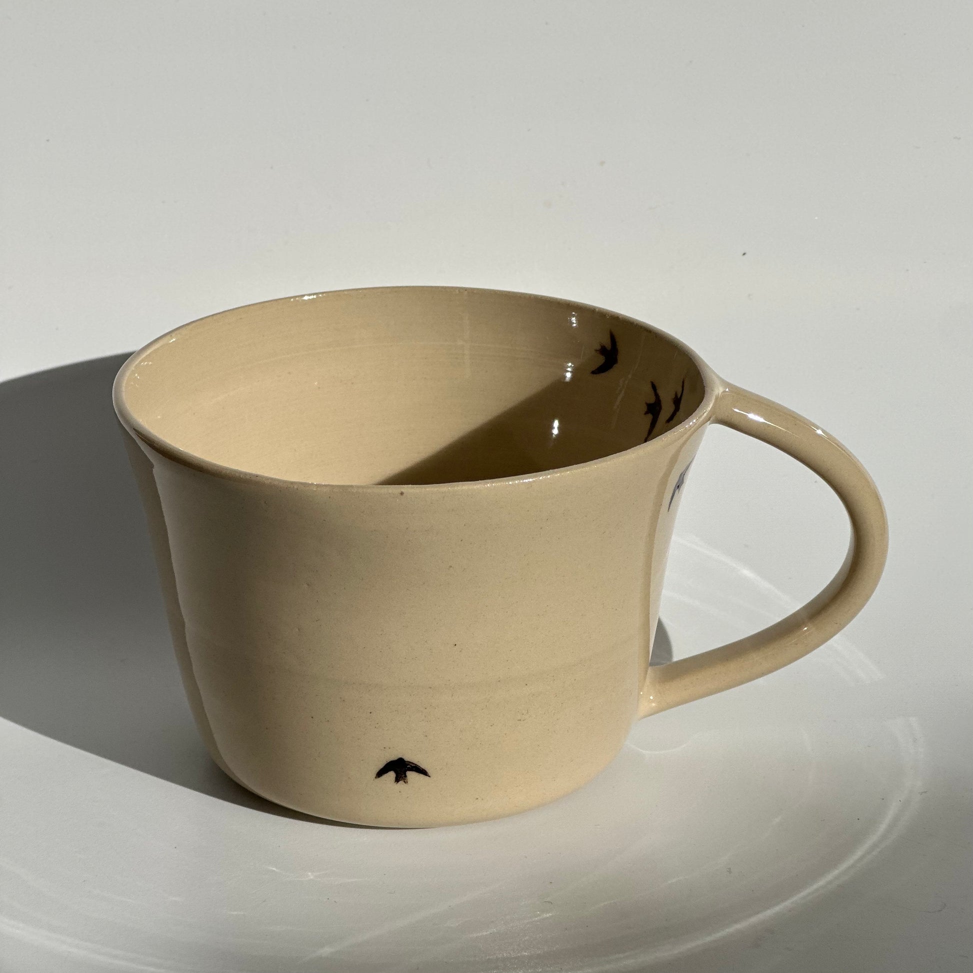 Smuk enkel kop med hank og med små sorte svaler udenpå og inde i koppen. Hver en kop er unik med variation i mønstret.