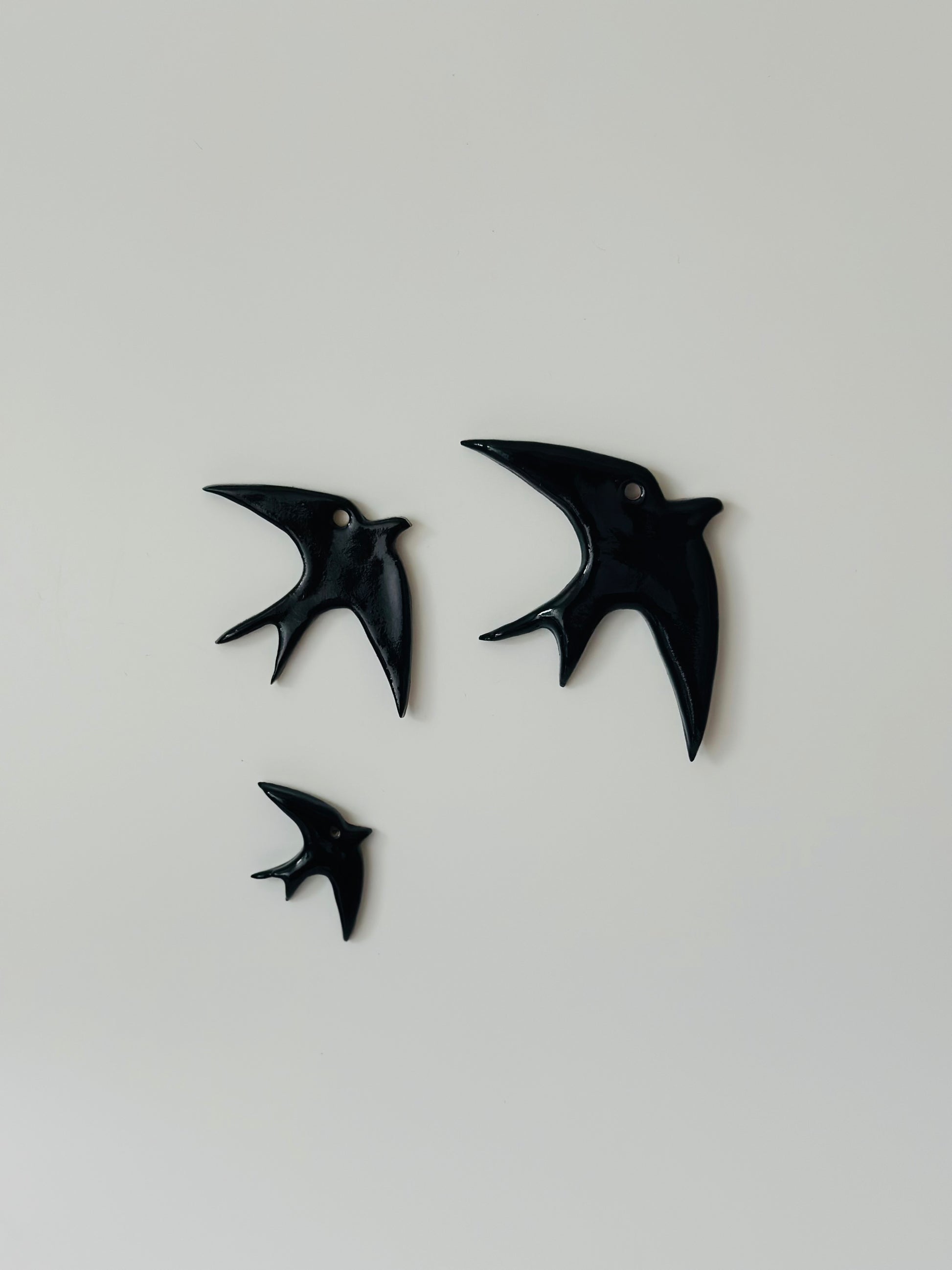 Fin lille og enkel svale til at hænge på væggen, som findes i en sort eller helt mørkeblå udgave med hvide pletter.